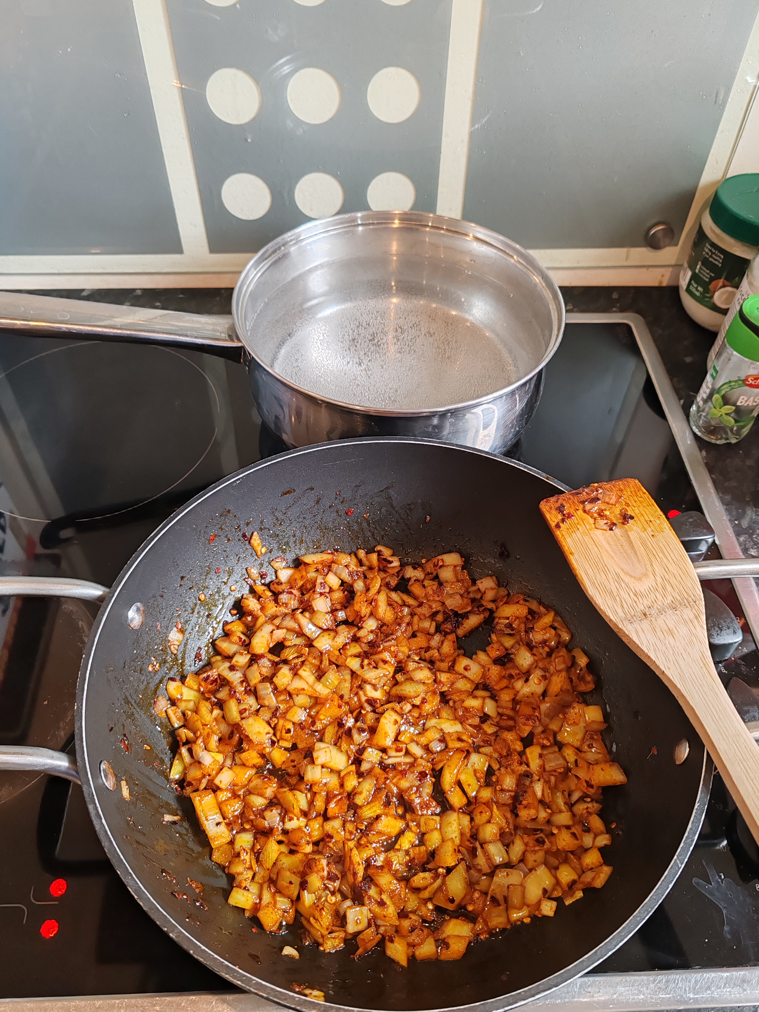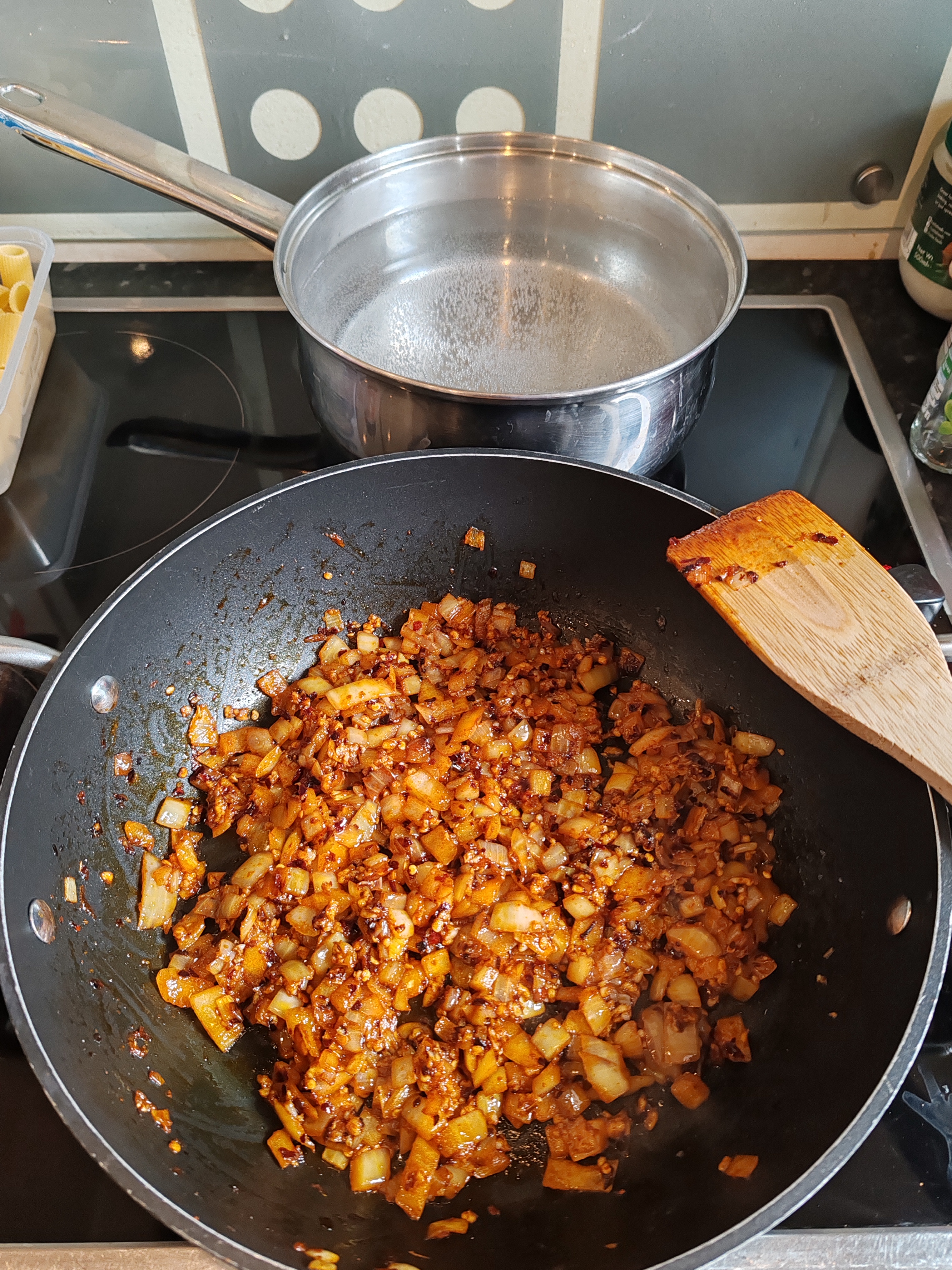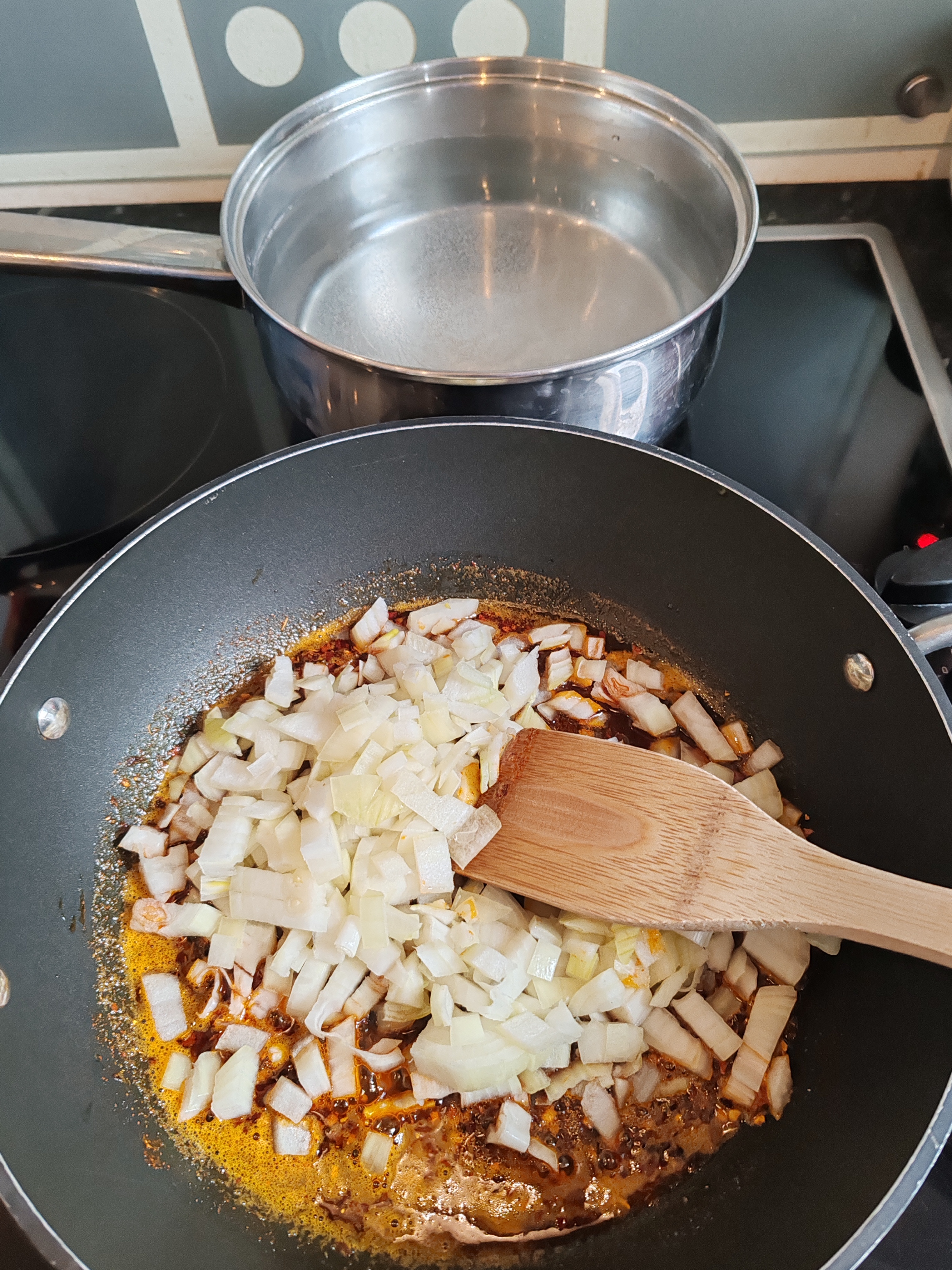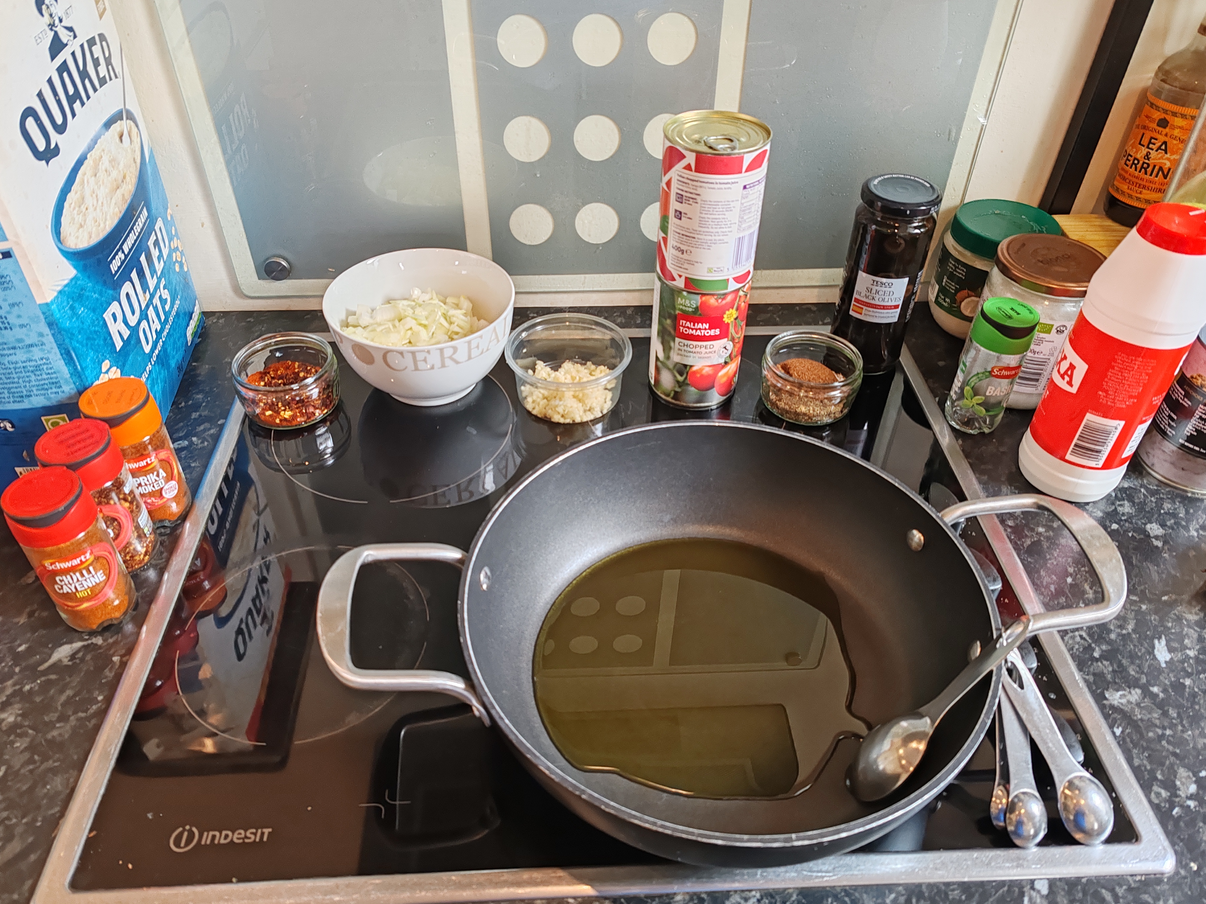 Measure out the chilli flakes and paprika together. Dice the onion. Crush/slice the garlic. When you're ready to go, heat 3 tablespoons of olive oil in a deep pan.