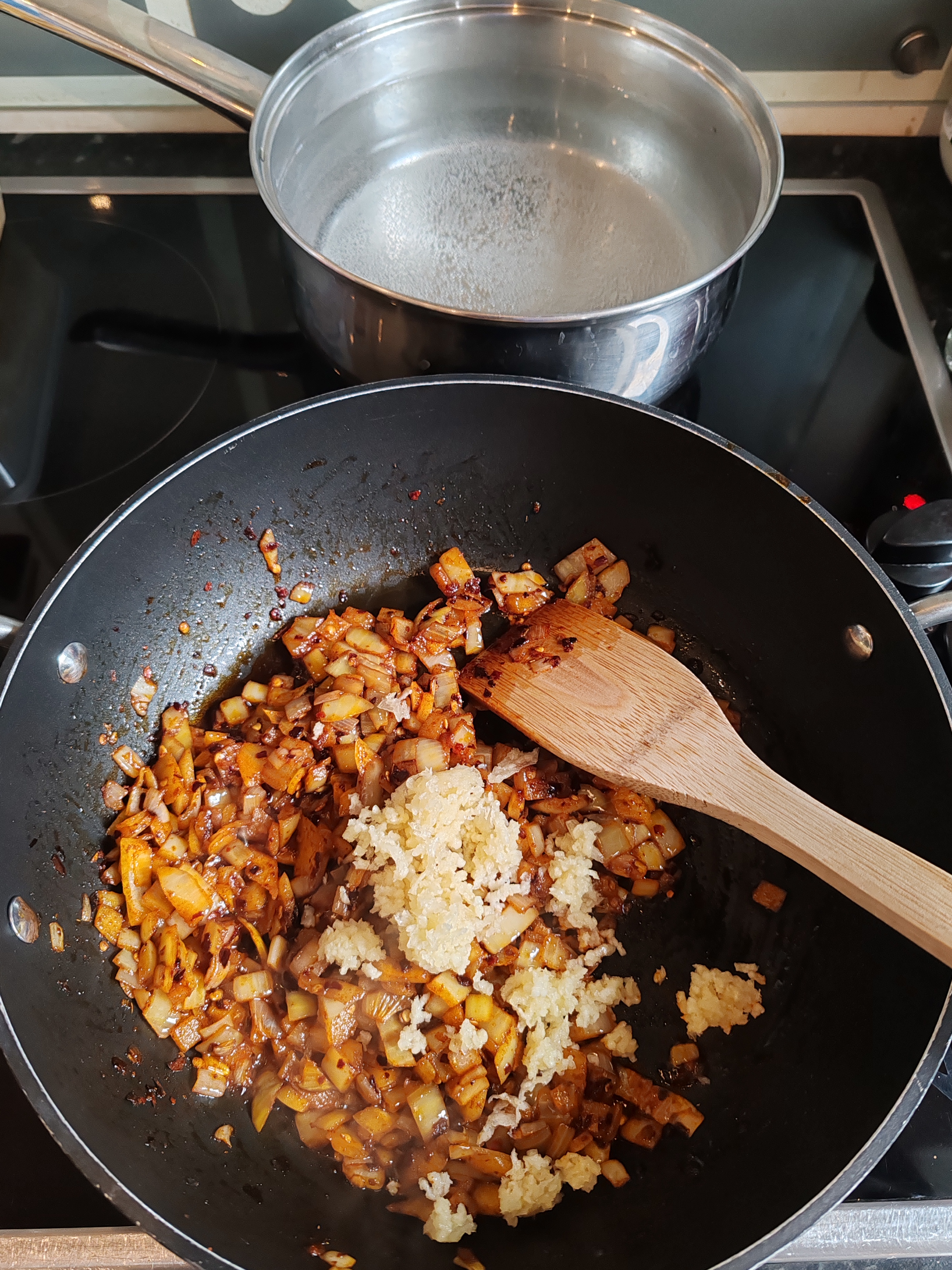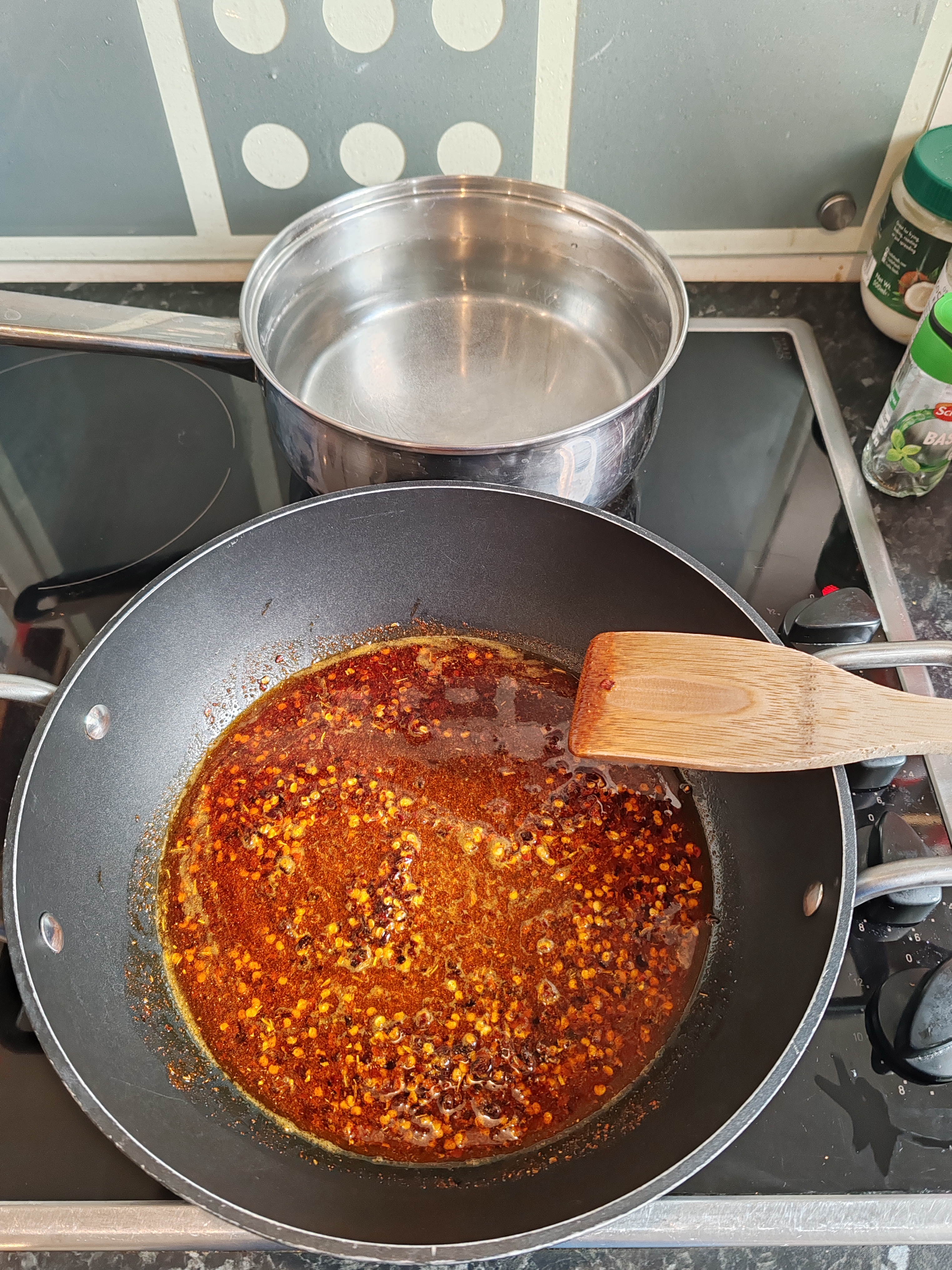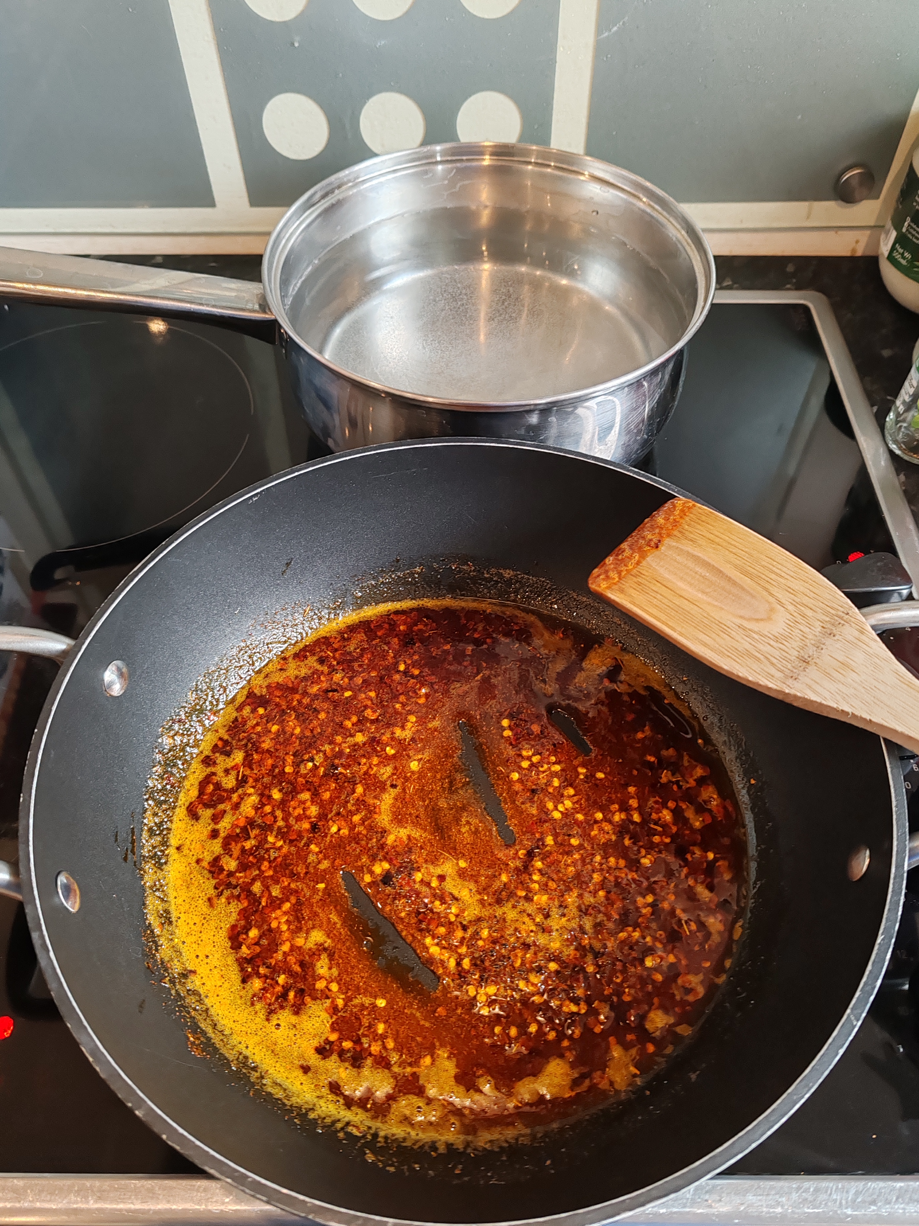 When the oil is hot, add the 3-5 teaspoons of chilli flakes and 2 teaspoons of paprika and sauté for 2 minutes.