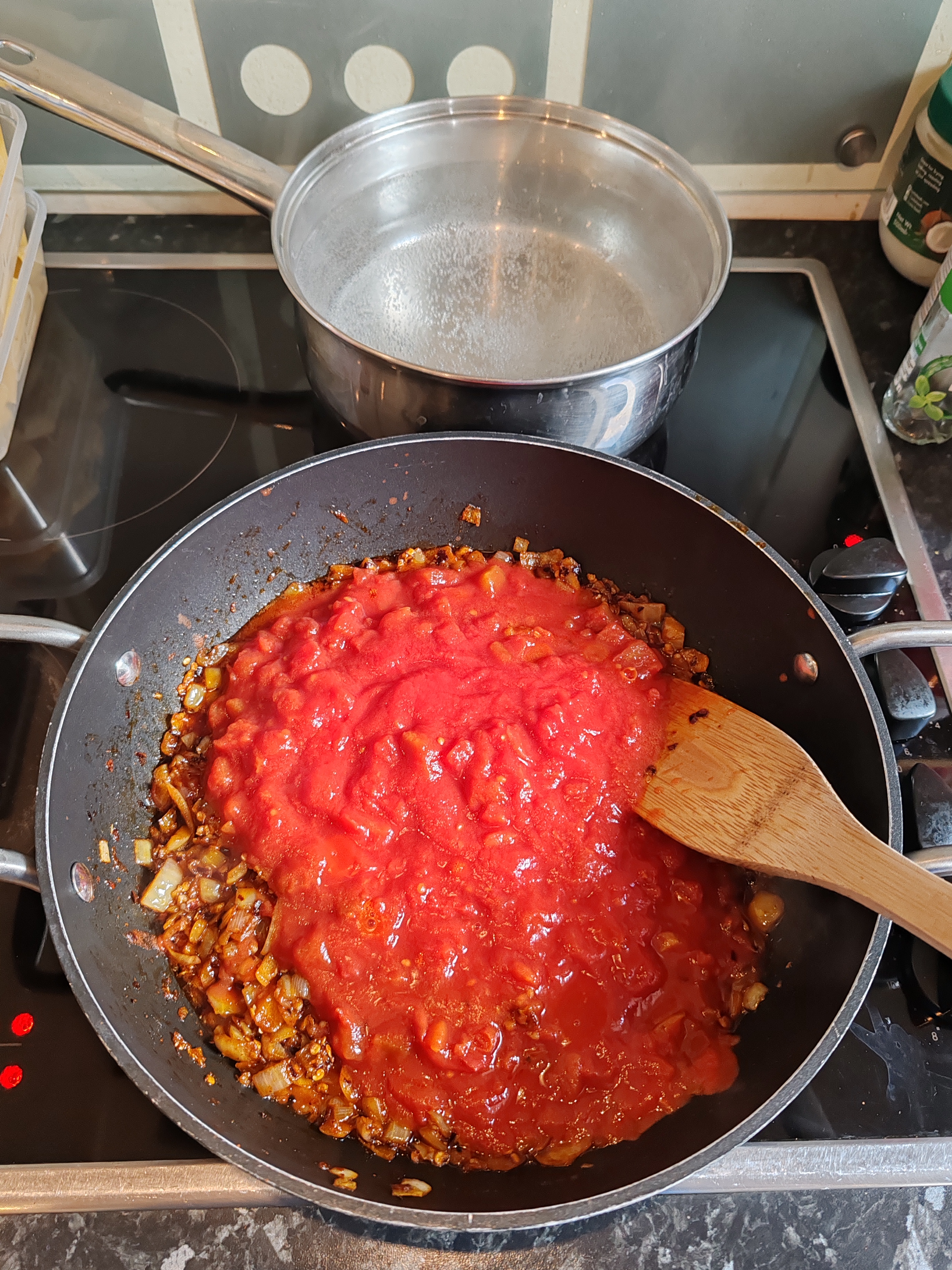 Add the 2 tins of tomatoes and stir well for about a minute.