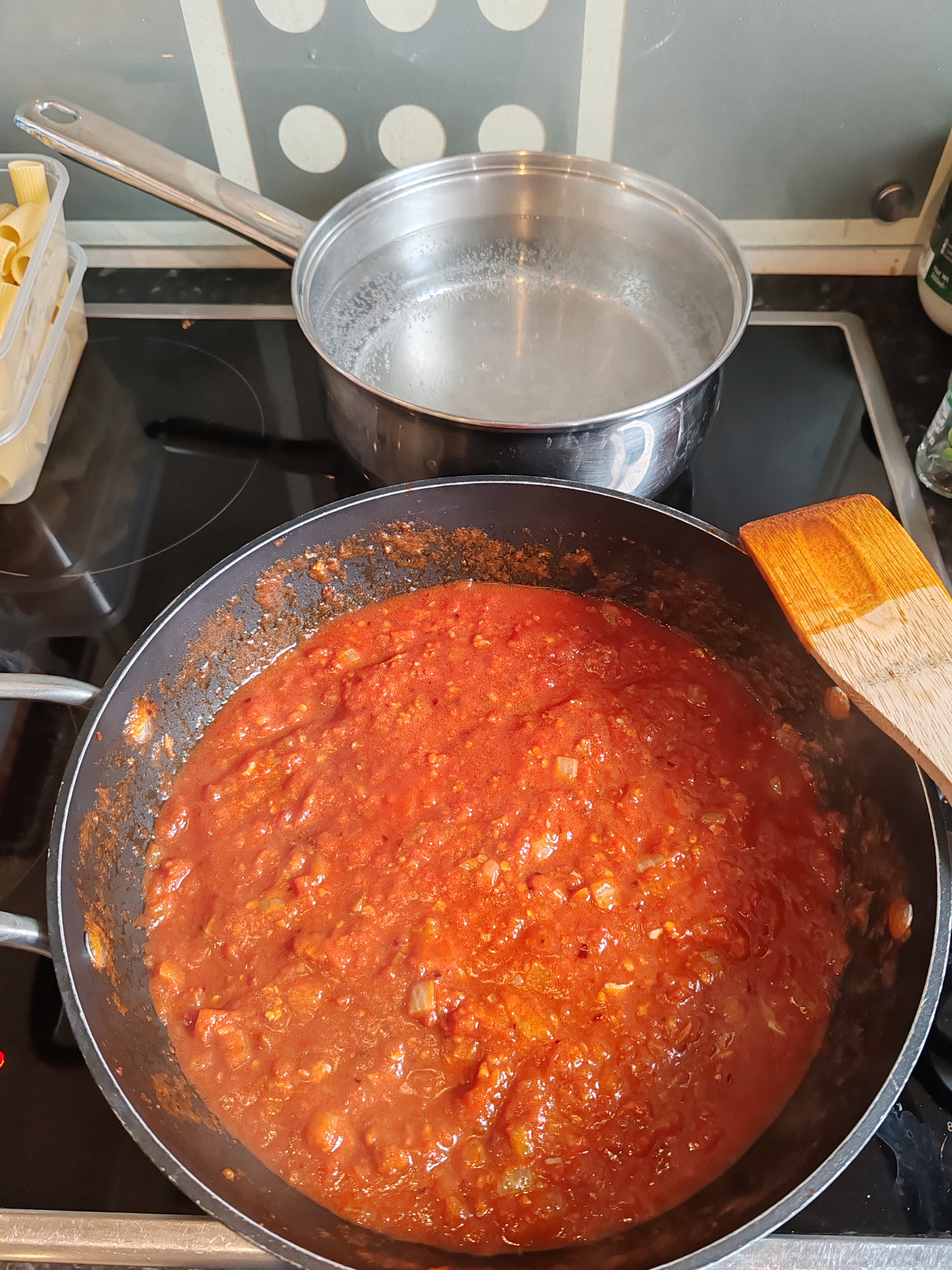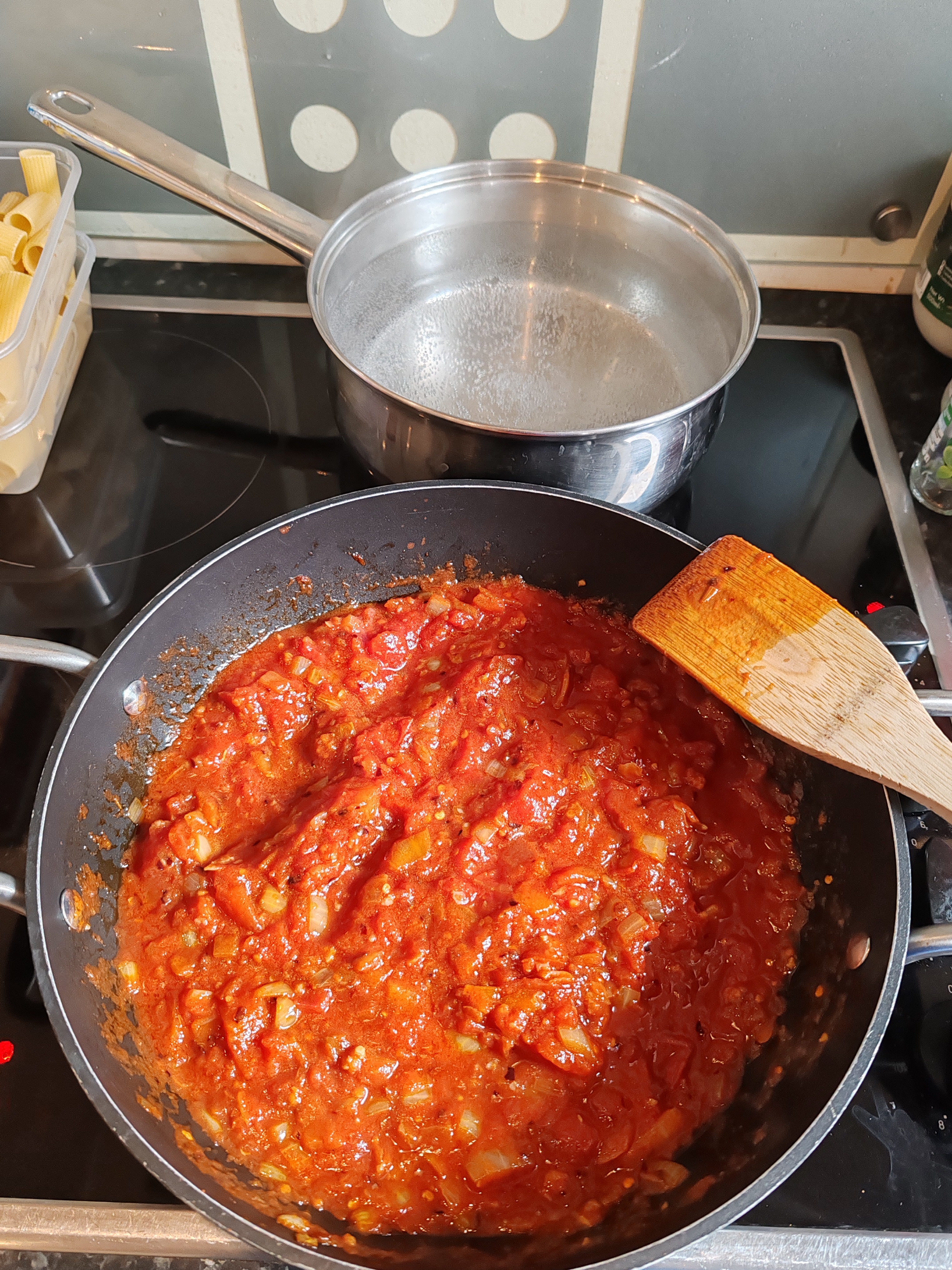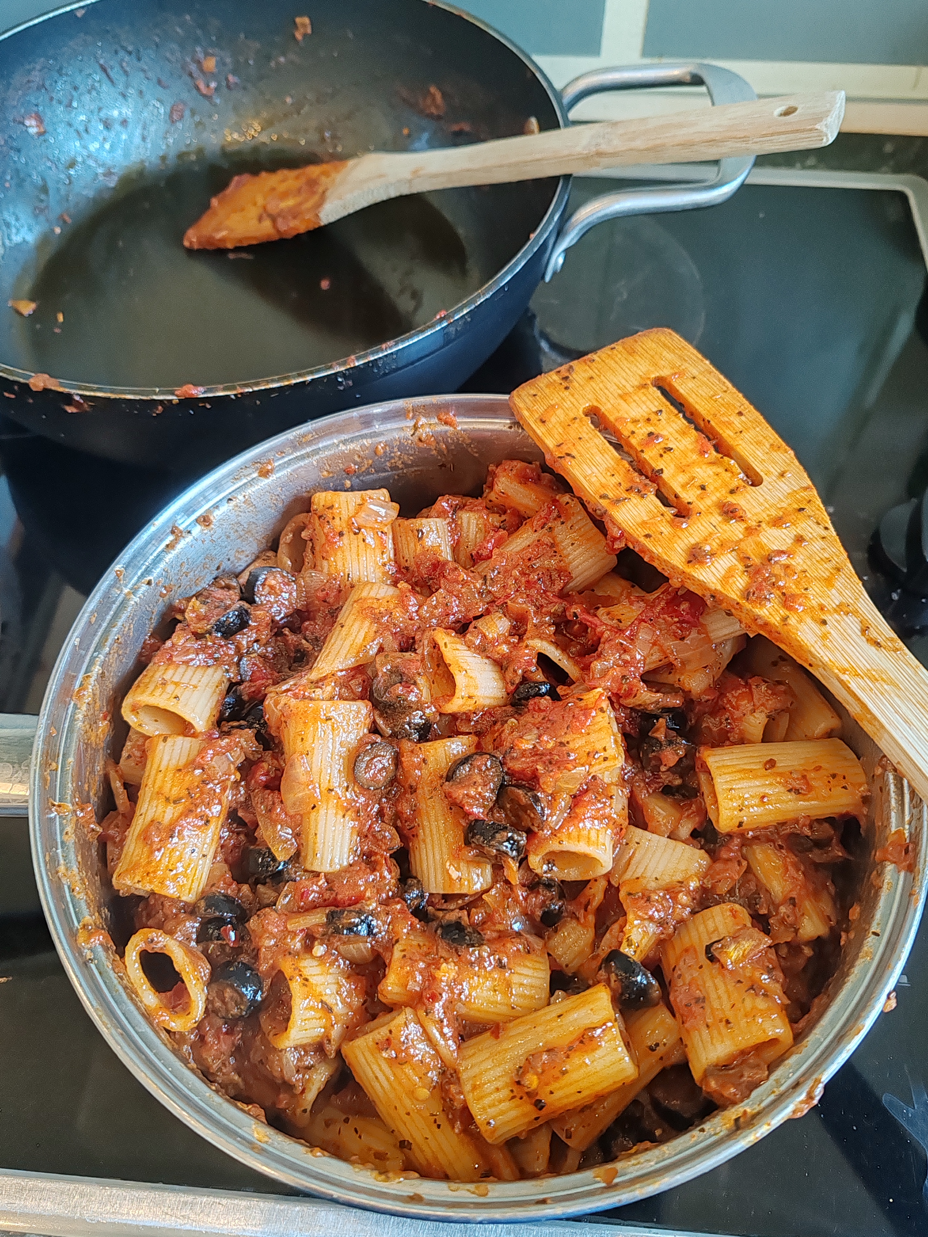 Now is a good time to add the pasta to a boiling pan and do any more prepping (e.g. slicing olives, measuring remaining ingredients)