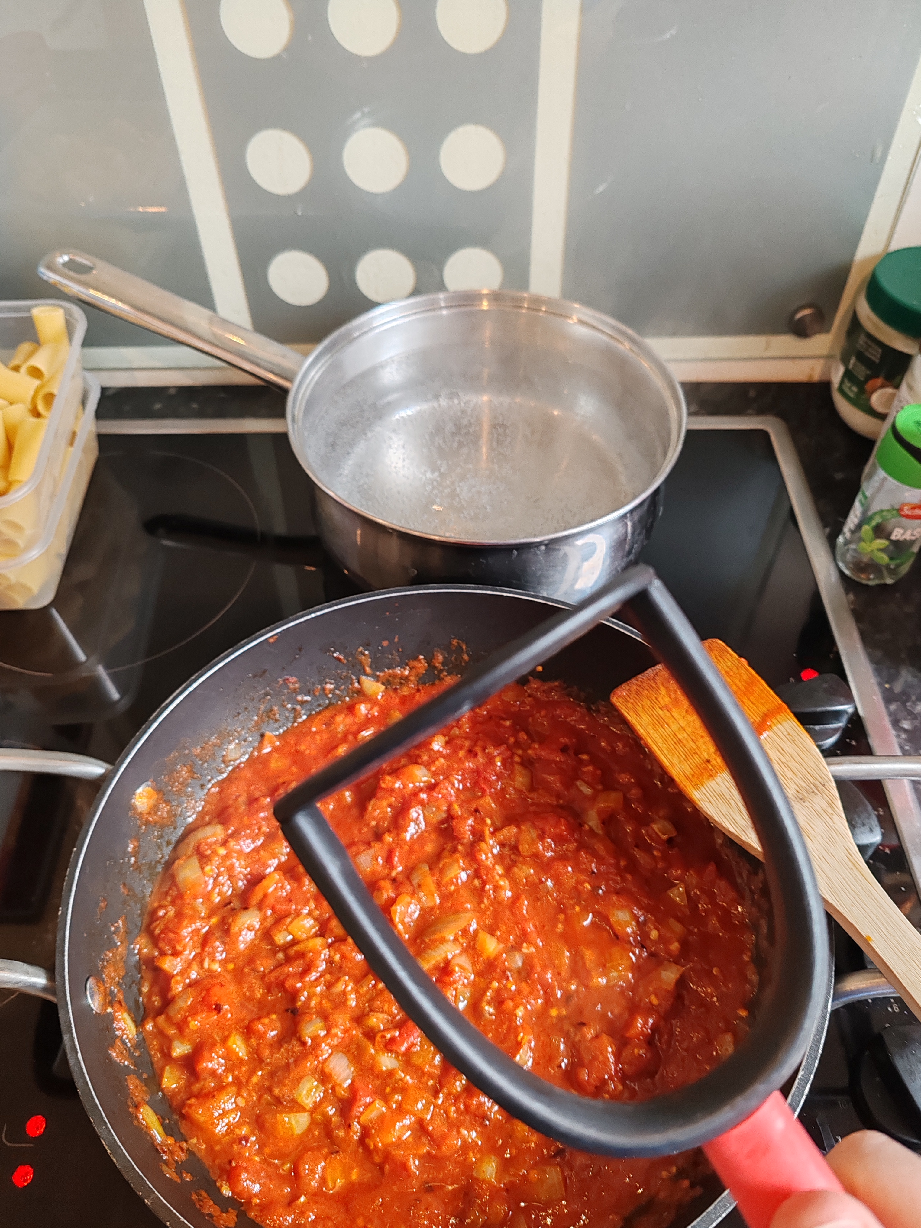 Now you want to mash up any large chunks to make a smoother sauces. The fastest way is to use potato masher.