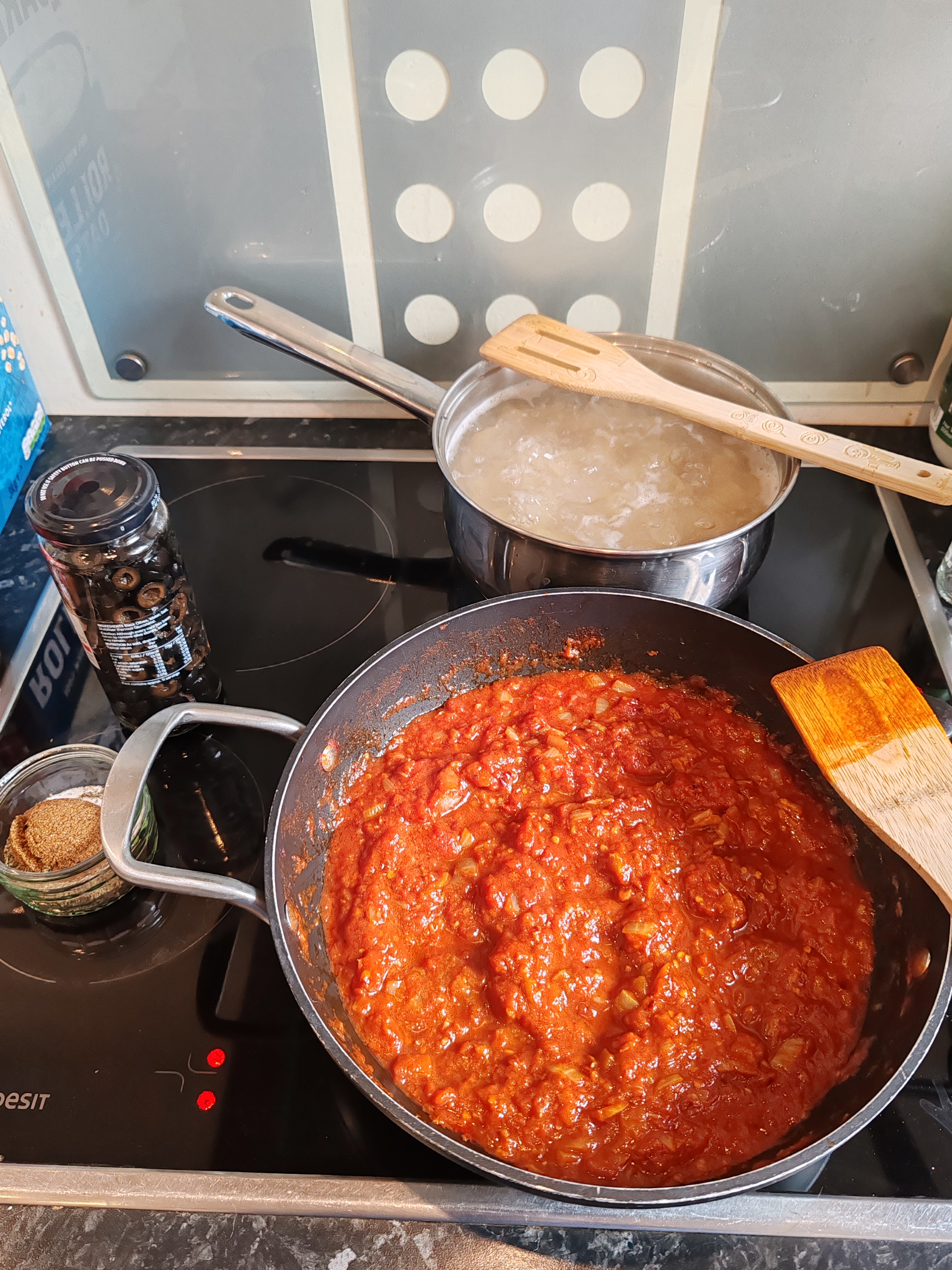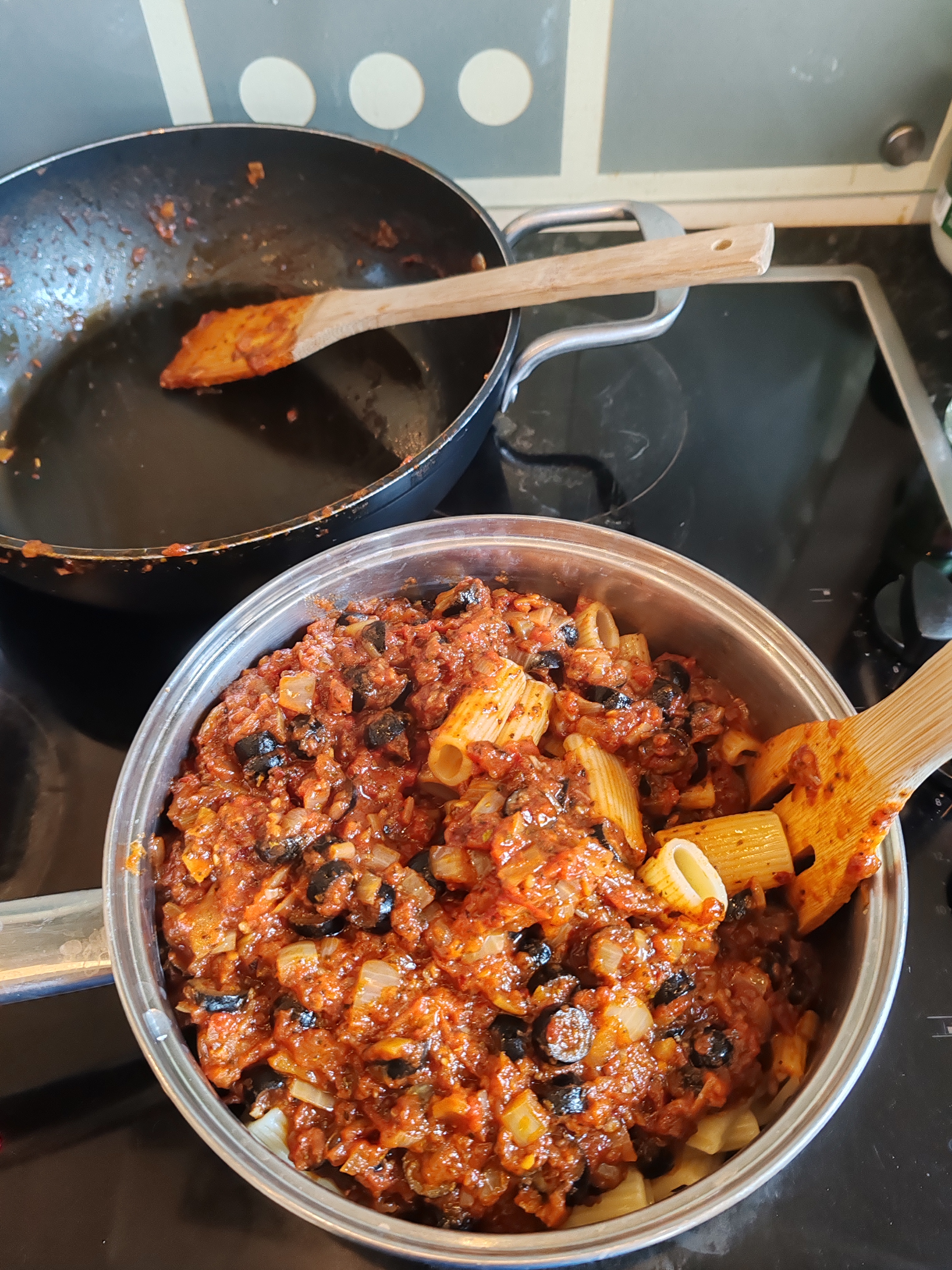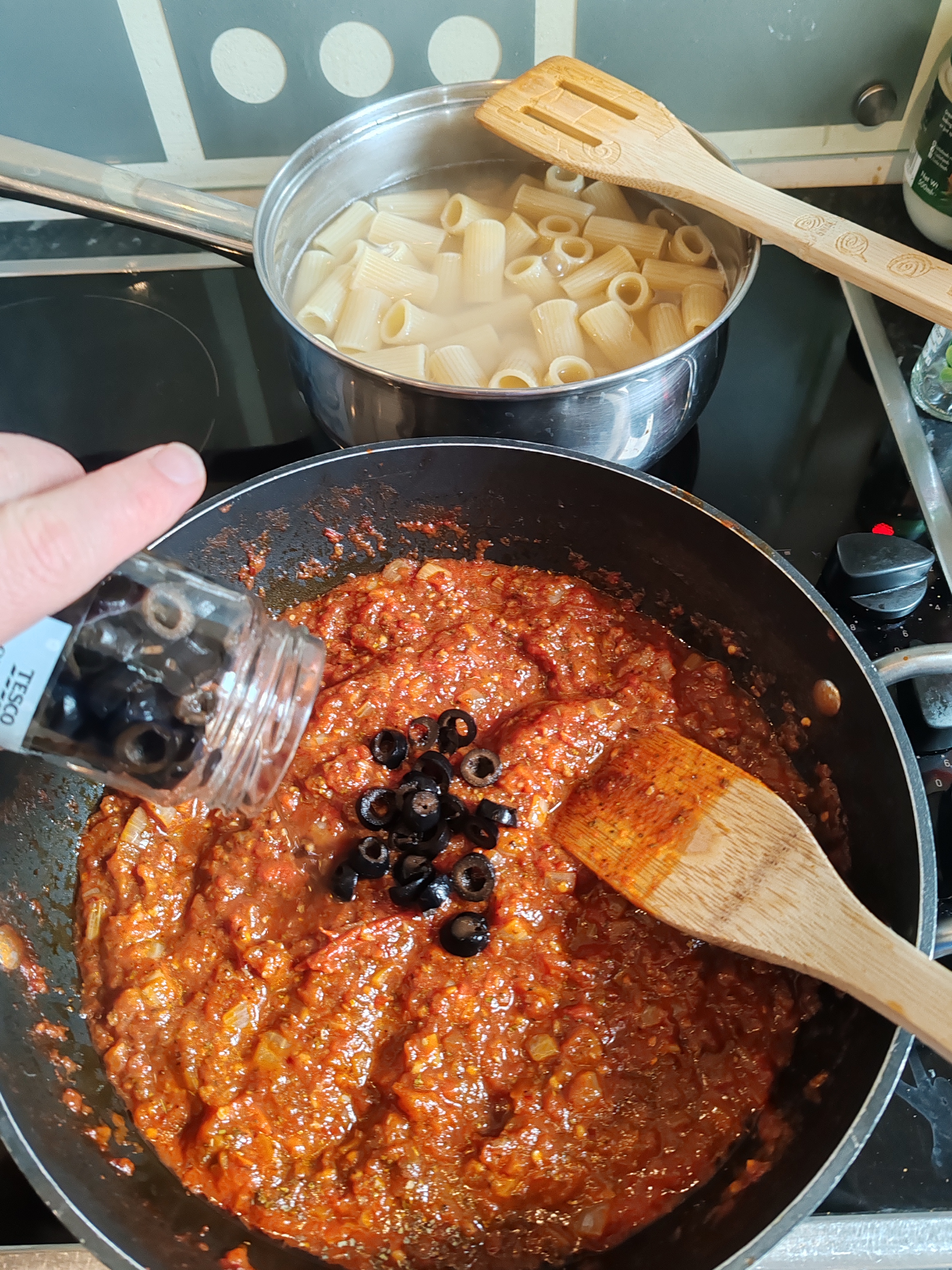 Add sliced/halved black olives, stir well and simmer for 5 minutes.