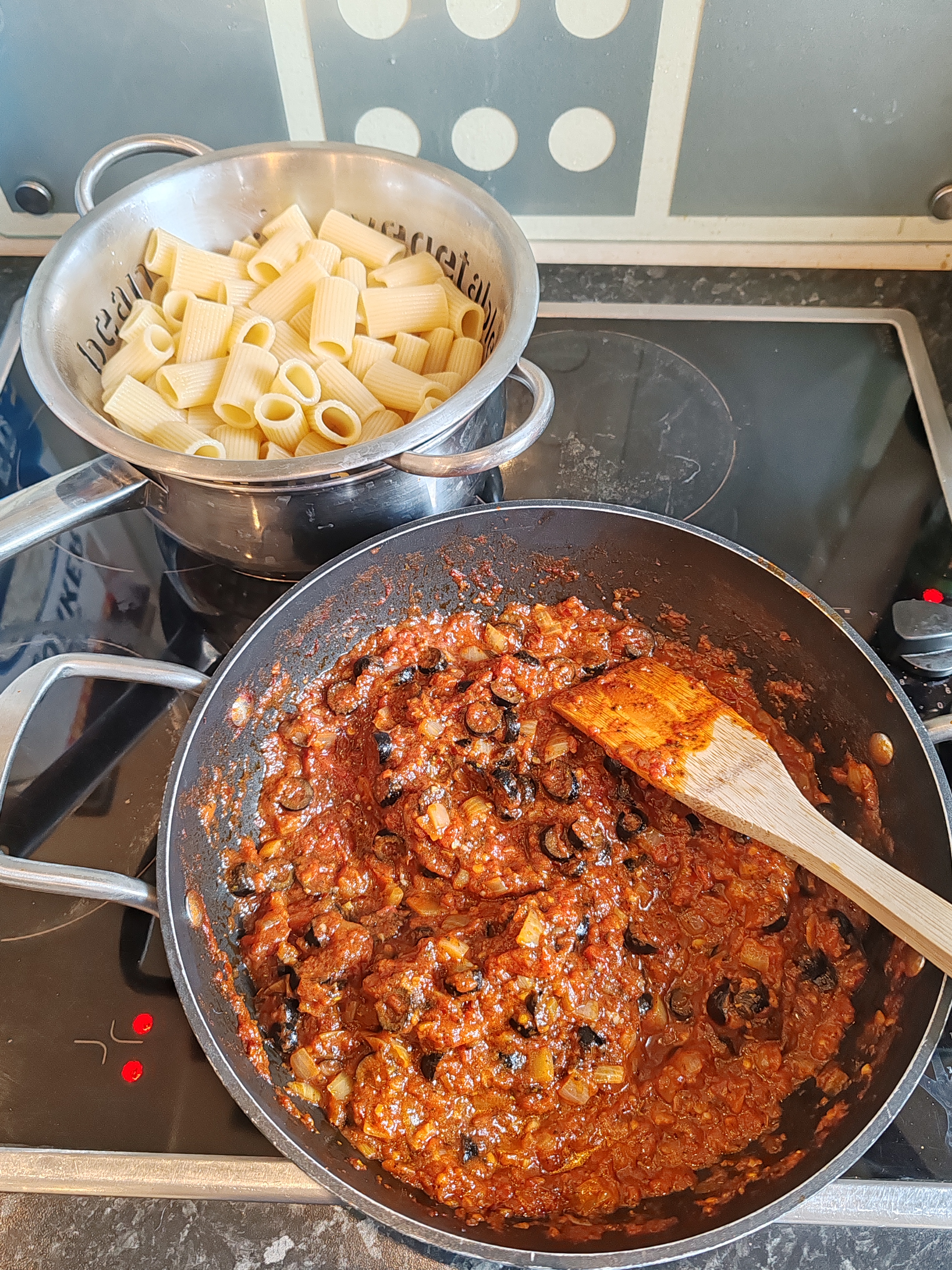The pasta will probably be ready around now, so drain it, while you wait for the sauce.